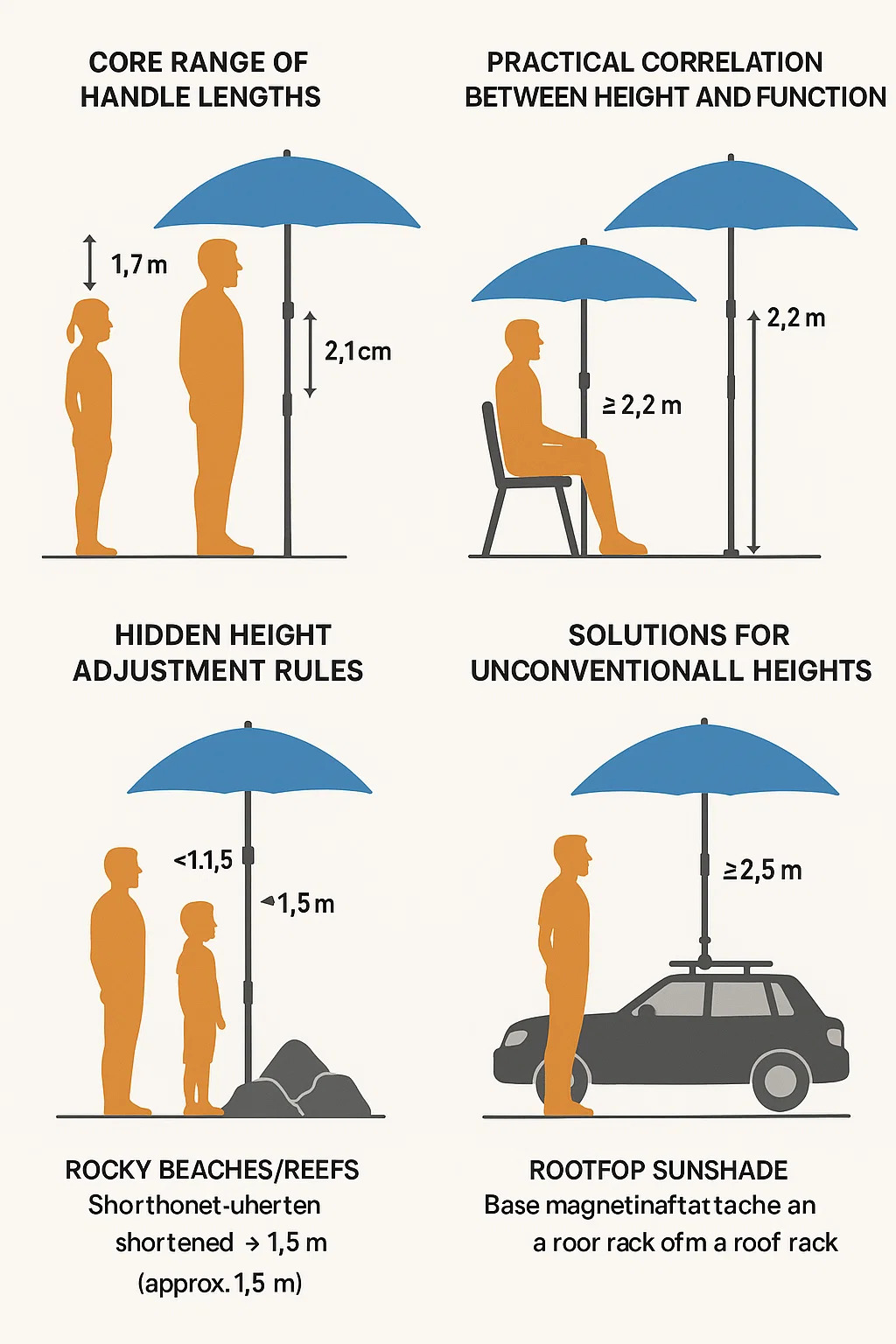 Короткі парасольки (≤1,8 метра): призначений для захисту від сонця під час сидіння. Висота краю відповідає спинці пляжного крісла (70-80 см), гарантуючи, що голова піддається сонці під час стояння.