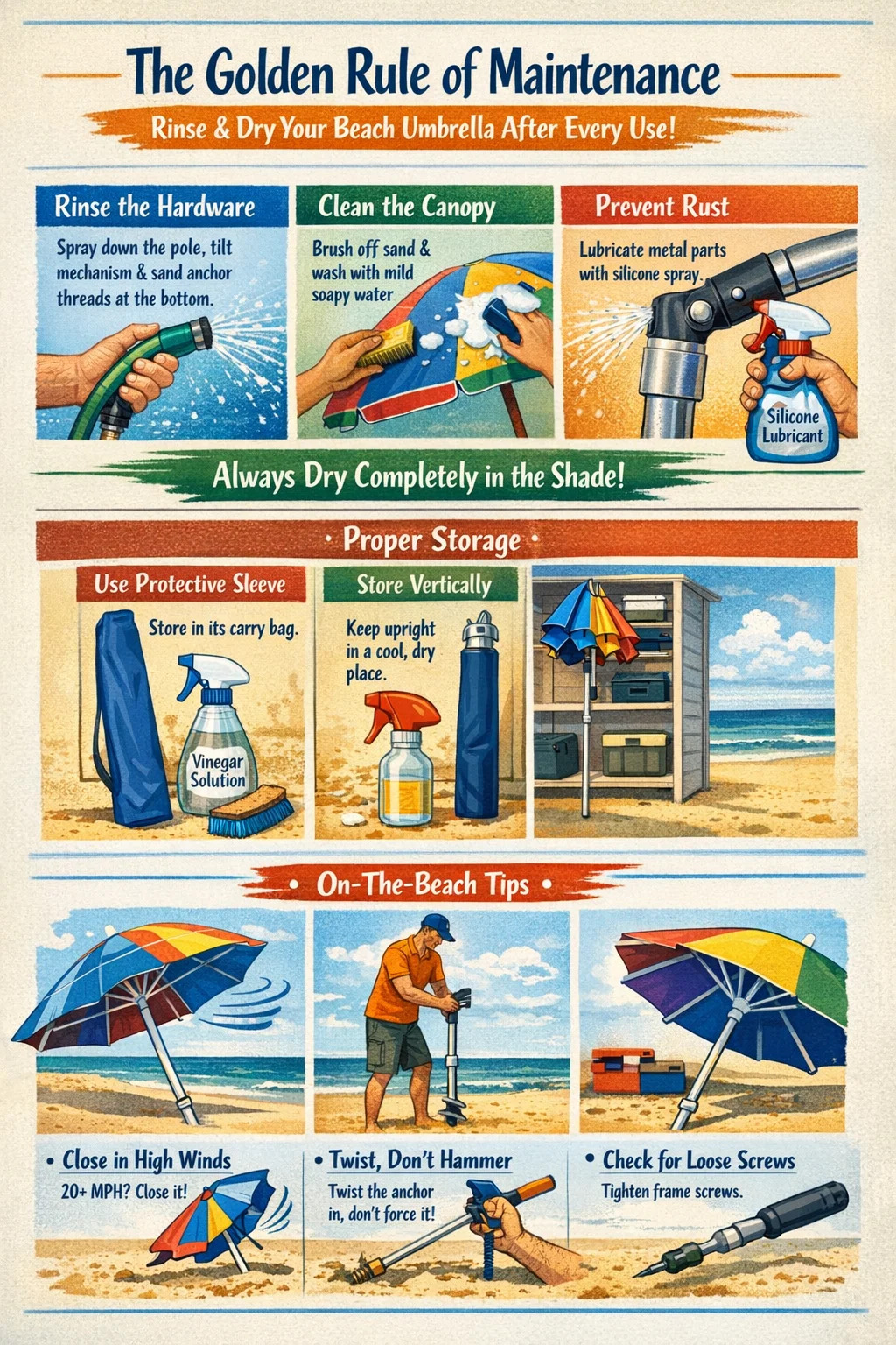 Найважливіший крок для підтримки a пляжна парасолька полягає в тому, щоб промийте його свіжою водою та повністю висушіть після кожного використання. Морська вода та пісок діють як корозійні агенти, які руйнують тканину та іржавіють металеві з’єднання. Витративши п’ять хвилин на промивання спорядження, ви можете продовжити його термін служби від одного сезону до кінця п'ять років надійної експлуатації .